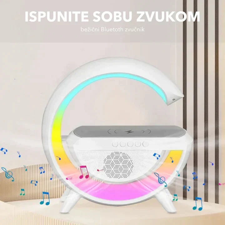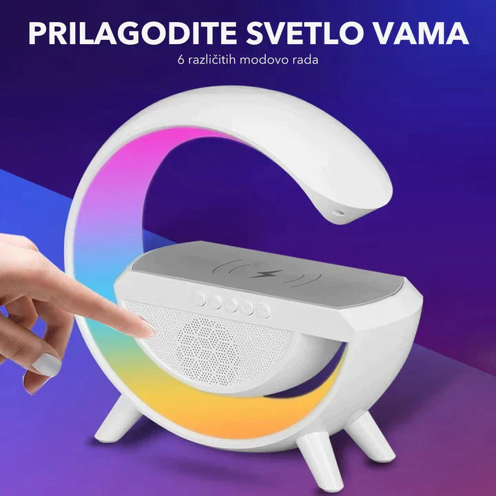 Ova moderna multifunkcionalna lampa je opremljena bluetooth zvučnikom, brzim bežičnim punjačem i spektakularnim RGB svetlom za sinhronizaciju muzike stvarajući jedinstveno audiovizuelno iskustvo.