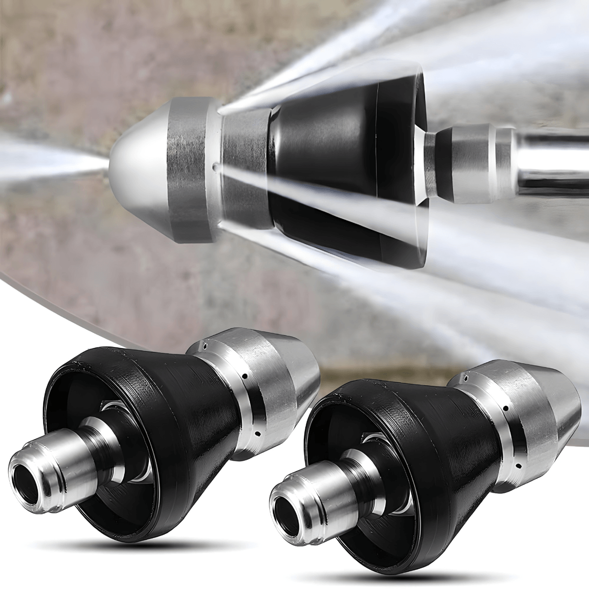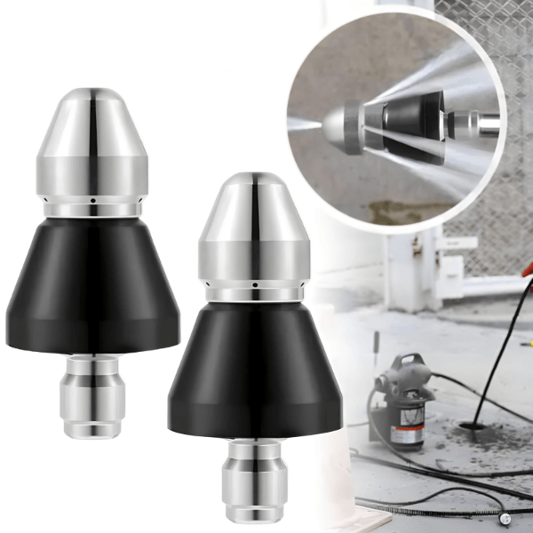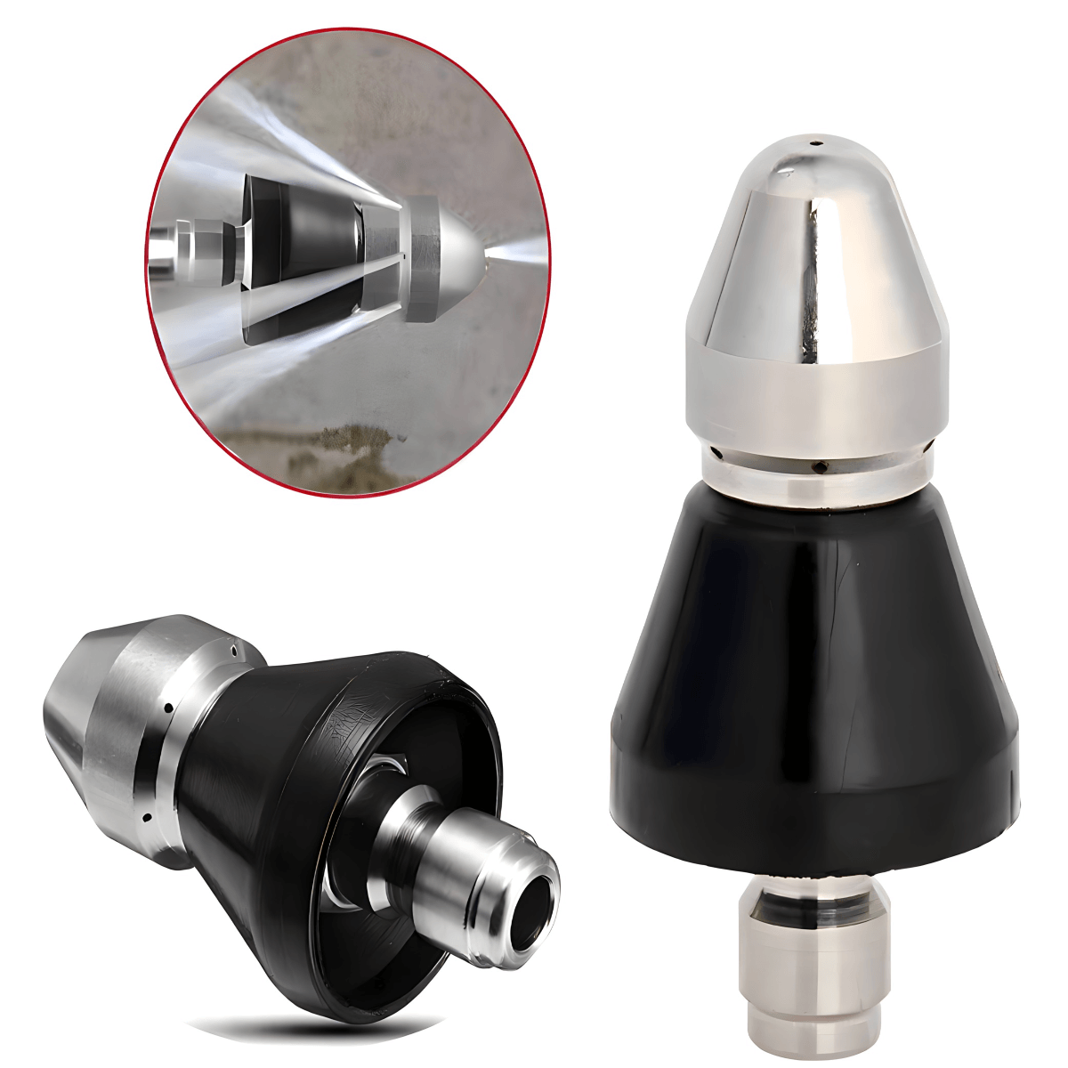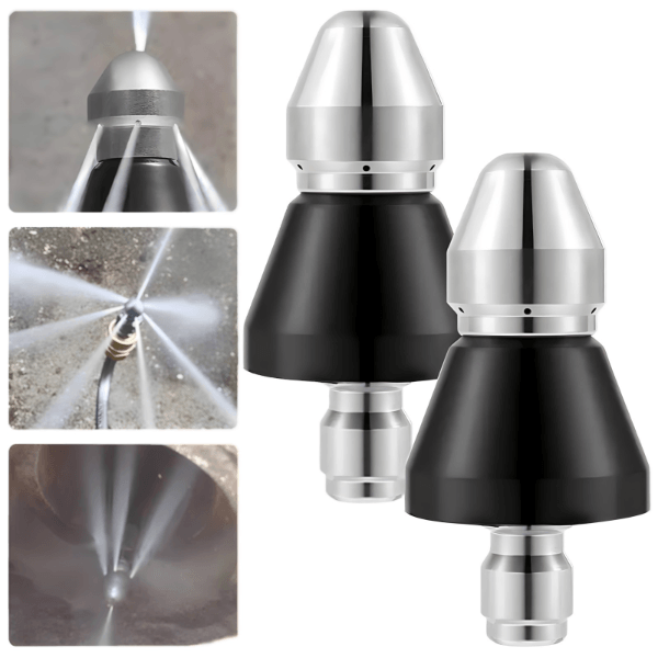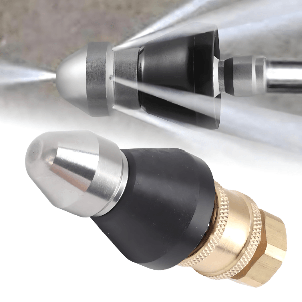 Naša posebna mlaznica radi kao mini super-junak za vaše cevi. Ima jedan deo koji šalje snažan mlaz vode pravo na zapušenje da ga razbije, i drugi deo koji sve to loše što je razbijeno ispire nazad. Dakle, ne samo da čisti put ispred sebe, već i pospremi za sobom.