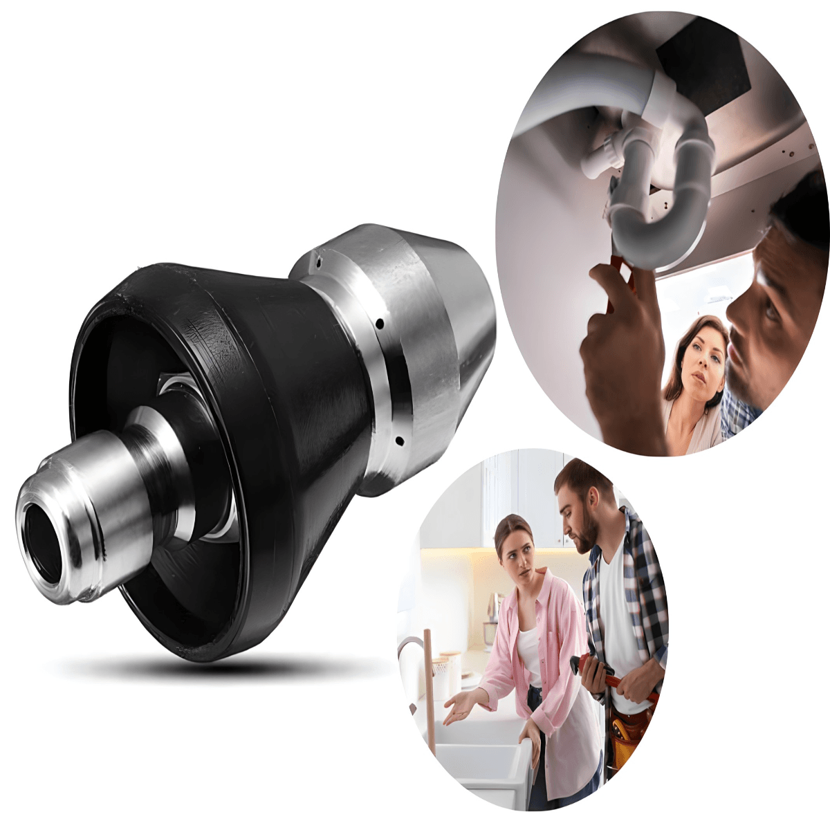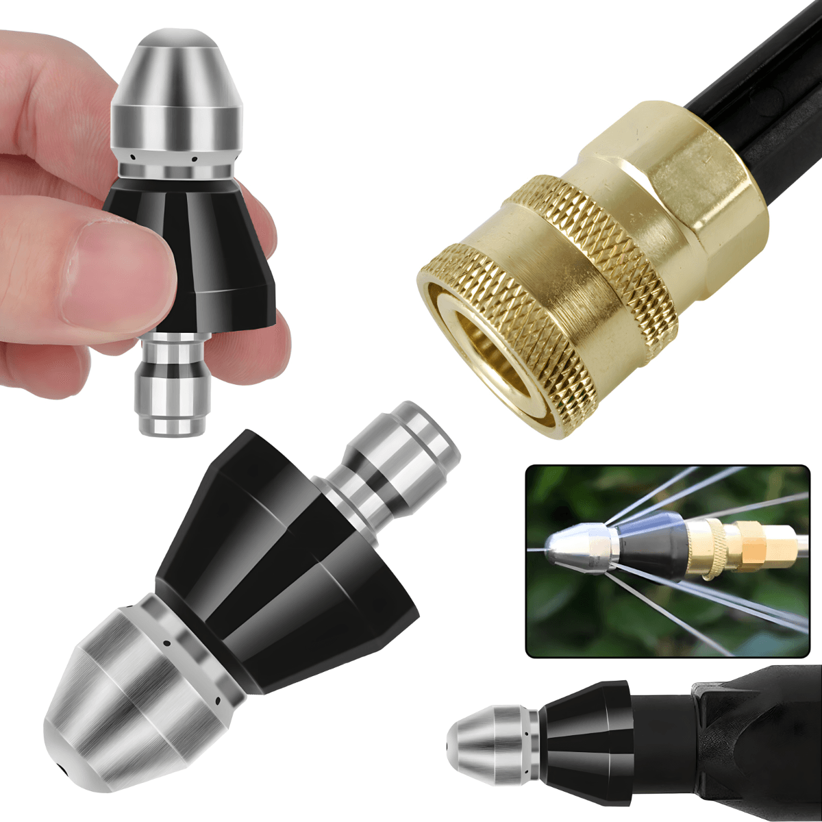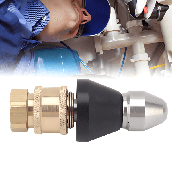 Naša posebna mlaznica radi kao mini super-junak za vaše cevi. Ima jedan deo koji šalje snažan mlaz vode pravo na zapušenje da ga razbije, i drugi deo koji sve to loše što je razbijeno ispire nazad. Dakle, ne samo da čisti put ispred sebe, već i pospremi za sobom.