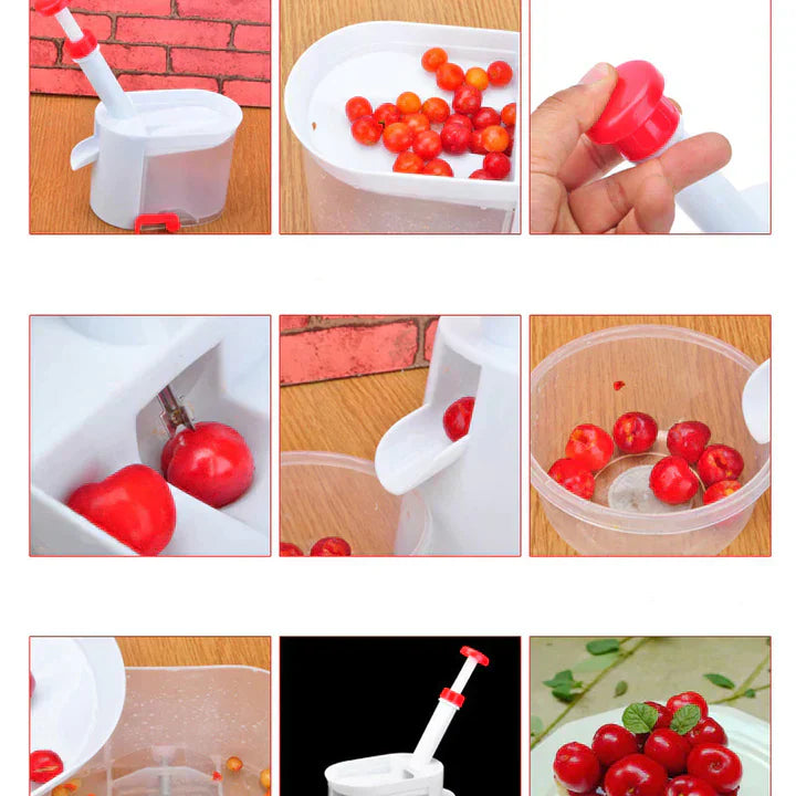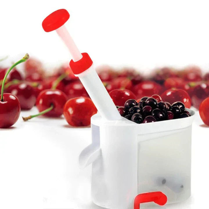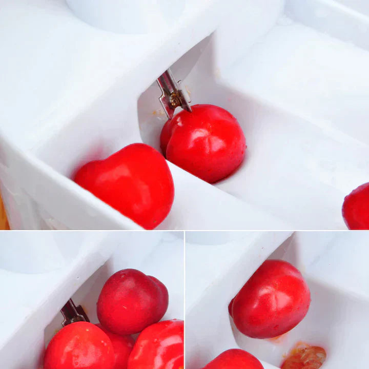 Način upotrebe: Pritiskanjem ručice, koštica pada u spremište dok se višnja odbija od gumenog uloška. Zahvaljujući dizajnu, višnje se čiste jedna po jedna, a gumene stopice sprečavaju klizanje po površini.