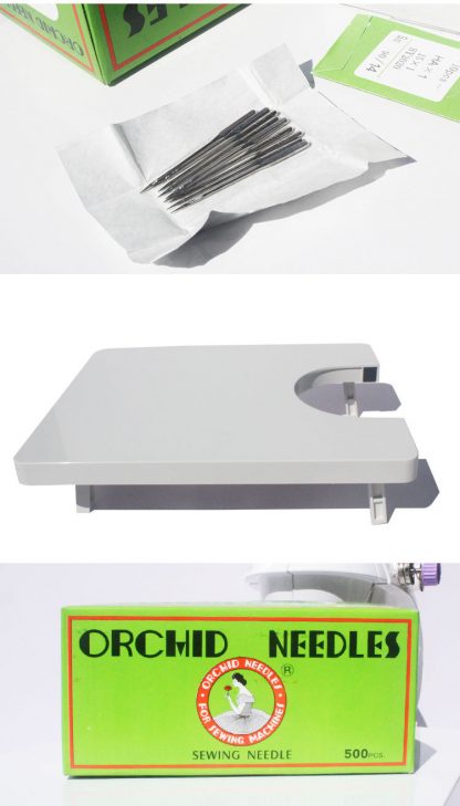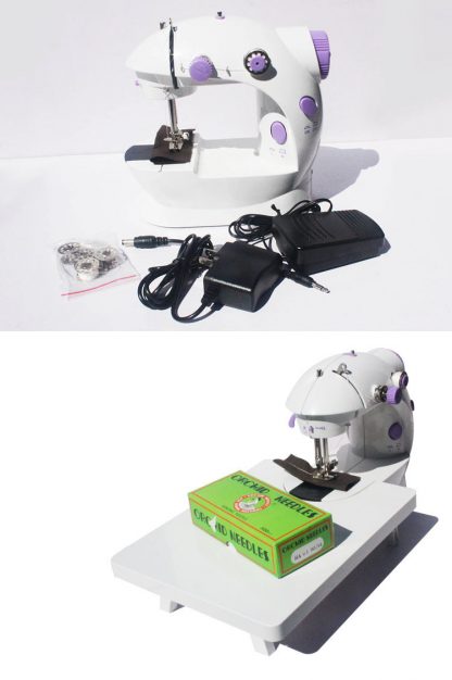 Paket sadrži: 1x Mini šivaća mašina, 1x AC adapter, 1x igla za uvlačenje konca, 1x pedala, 1x rezervna igla, 1x prazan kalem, 2x namotana kalema konca (crni i beli).