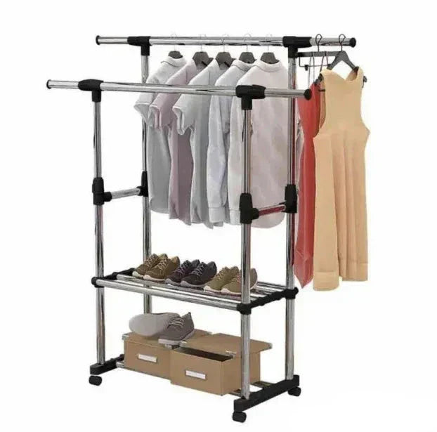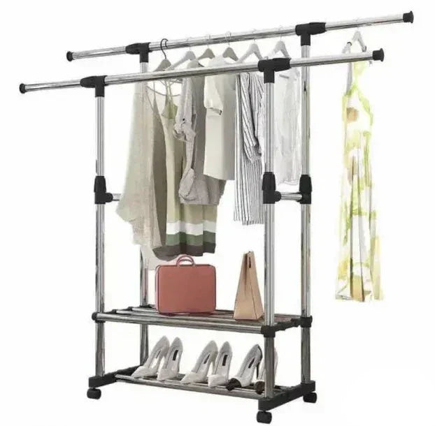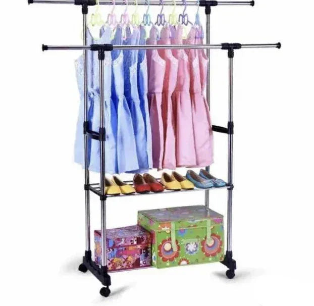 Discover the ultimate solution for your wardrobe organization with our Foldable and Highly Practical Clothing Rack. Designed with two spacious shelves, this rack is perfect for both clothing and footwear.