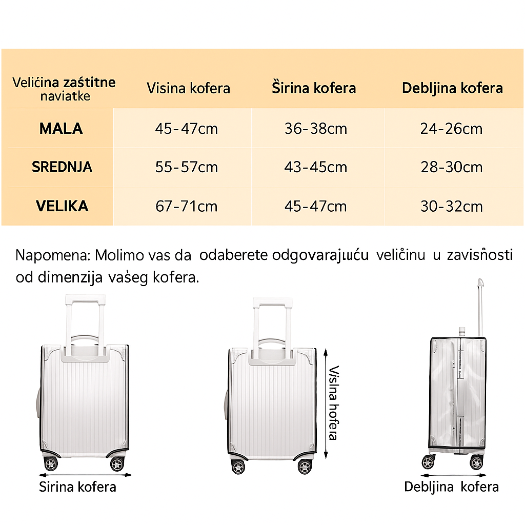 Odgovara većini standardnih modela kofera – jednostavno izaberite odgovarajuću veličinu prema dimenzijama.